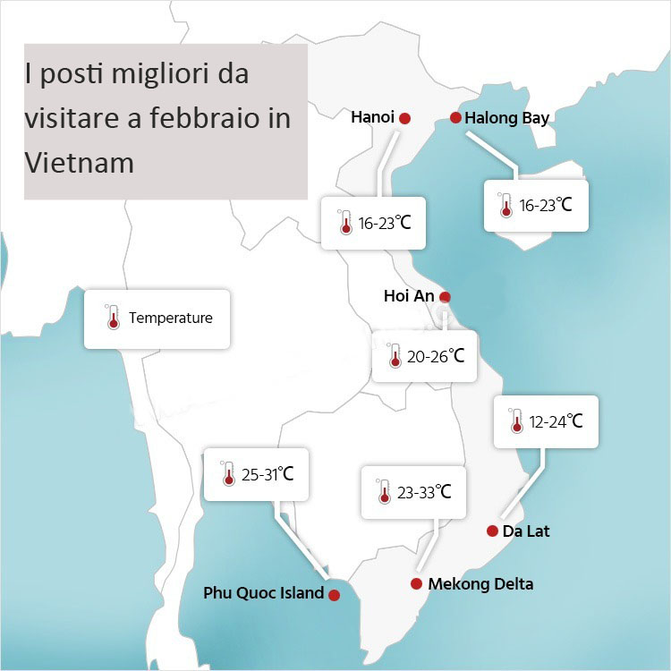 Il clima in Vietnam a febbraio è fresco e confortevole. È la stagione secca, con quasi nessuna pioggia in tutto il paese a febbraio. Questo rende febbraio uno dei periodi migliori per visitare tutte le parti del Vietnam.